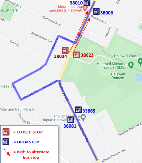 Buses travelling eastbound towards The Palms will follow the normal route to Halswell Rd, turn left on Nicholls Rd, turn right on Oakridge St, turn right on Wales St, turn left on Lillian St, and turn left on Halswell Rd to resume the normal route.