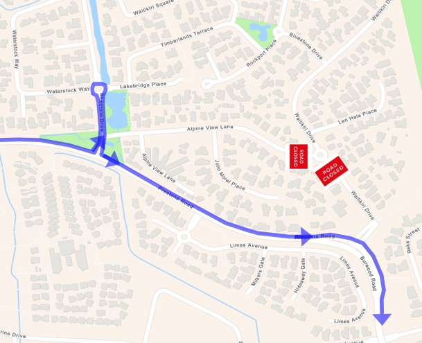 Afternoon trips travelling towards Queenspark will follow the normal route to Burwood Rd, continue on Prestons Rd, turn right on Bluestone Dr, take the 4th exit at the Waterstock Way roundabout onto Bluestone Dr, and turn right on Prestons Rd to resume the normal route.