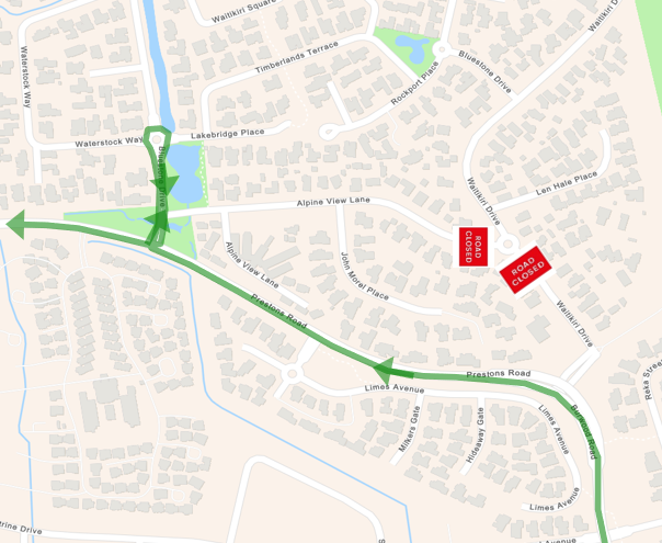 Morning trips travelling towards AGHS and SBHS will follow the normal route to Bluestone Dr, continue on Bluestone Dr, turn left on Prestons Rd, and continue on Burwood Rd to resume the normal route.