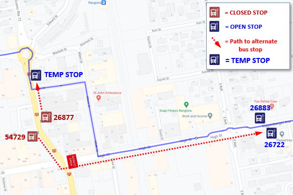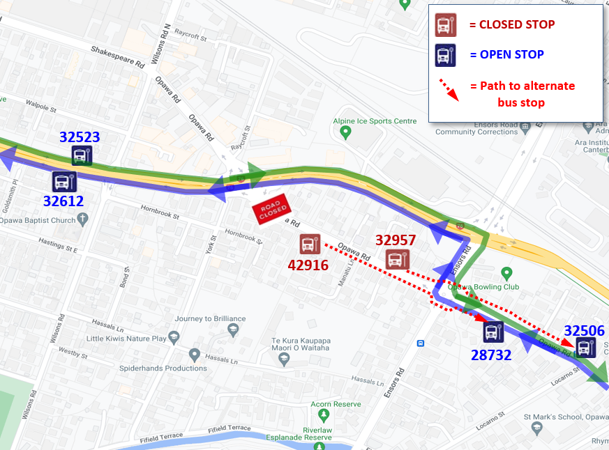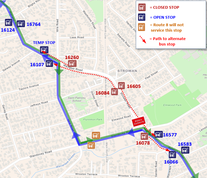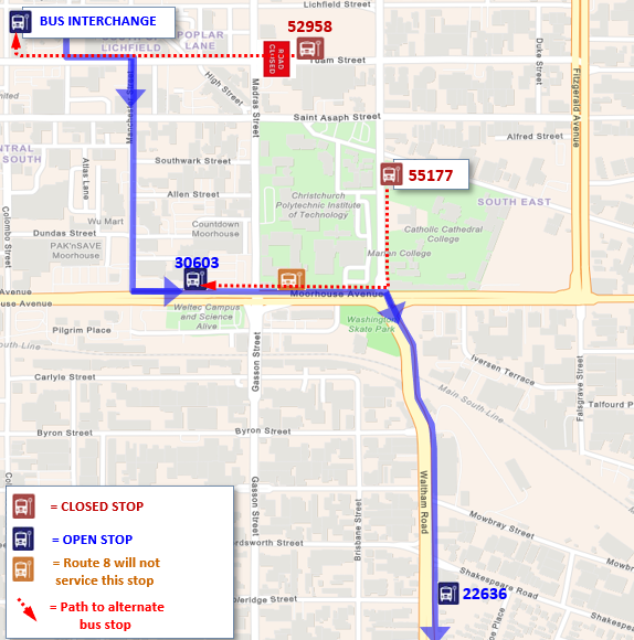Passengers who normally use bus stops 50847 or 33655 on Selwyn St should instead use 50875, and passengers who normally use stops 43487, 22071 or 29565 should instead use the temporary bus stop on Bletsoe Ave near Selwyn St. View detour map