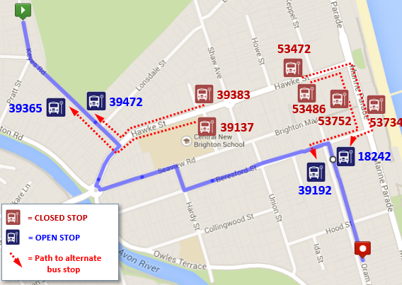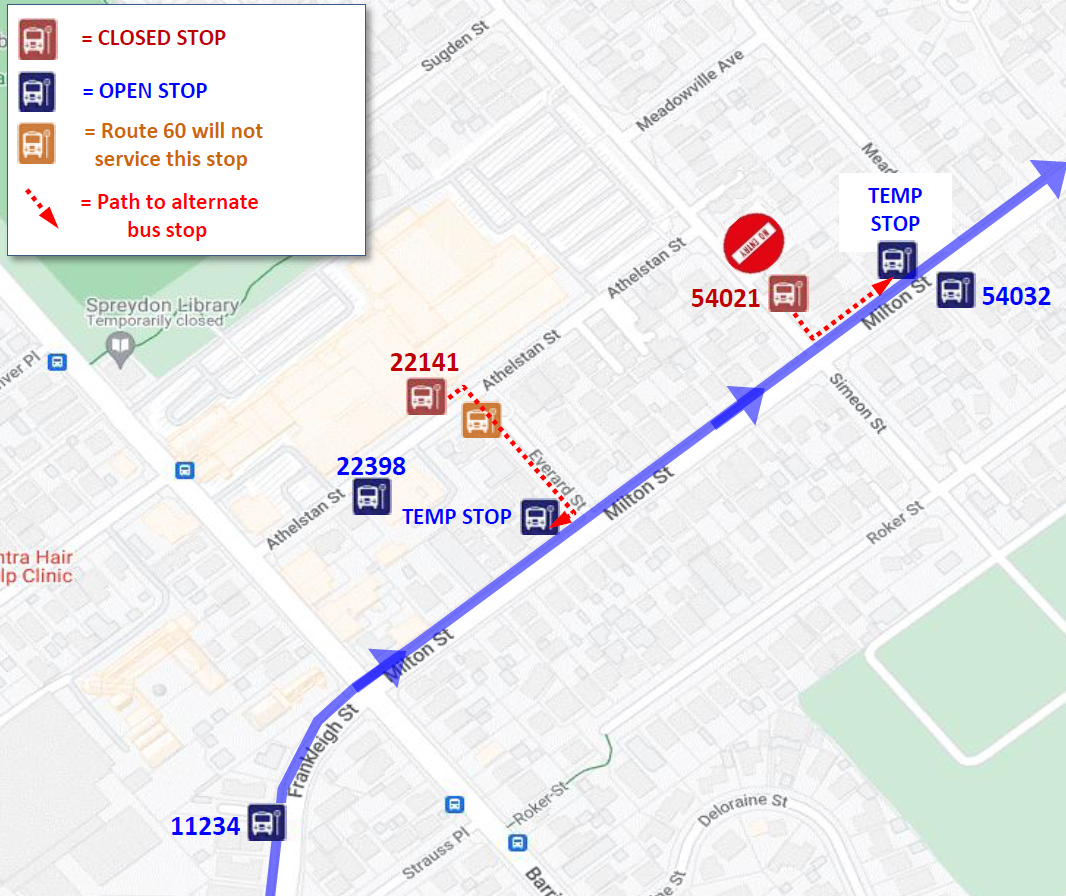Bus stops 29130, 43487 will be closed and passengers should use 33664 instead. Passengers normally using 29148 should instead use the temporary stop on Bletsoe Ave.