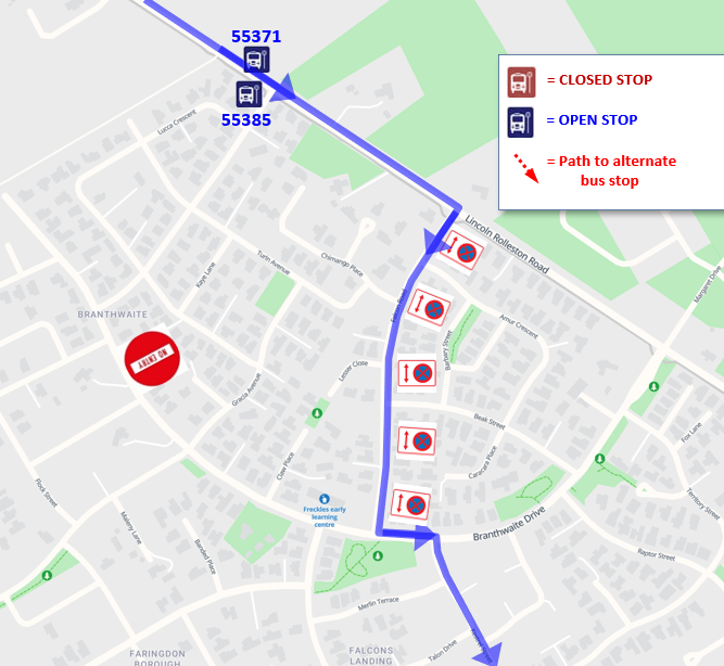 Buses travelling westbound towards the city will continue the normal route to Lincoln Rolleston Rd, continue on Lincoln Rolleston Rd, turn right on Branthwaite Dr, and turn left on Kestrel St to resume the normal route.