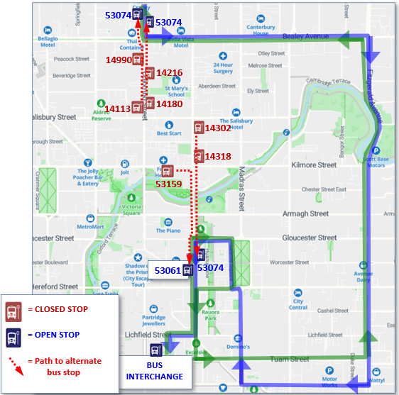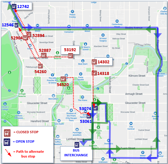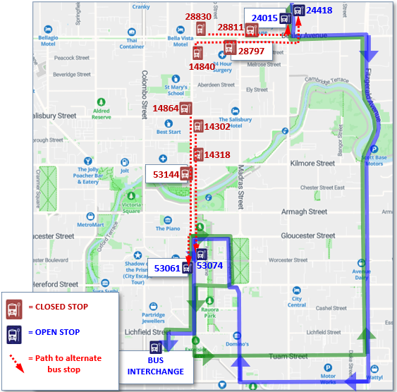 From first bus till 10:30am - Buses travelling northbound towards the Airport will follow the normal route to the Bus Interchange, exit via Tuam St, continue on Tuam St, turn left on Fitzgerald Ave, turn left on Bealey Ave, and turn right on Carlton Mill Rd to resume the normal route.