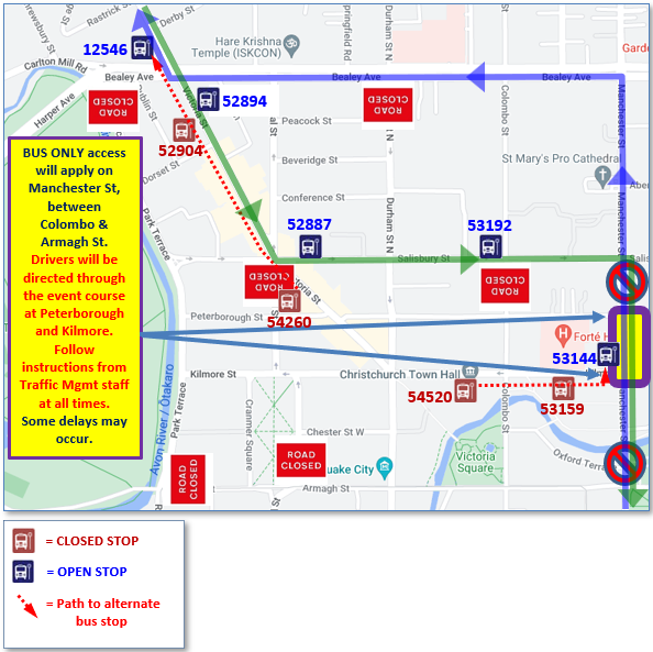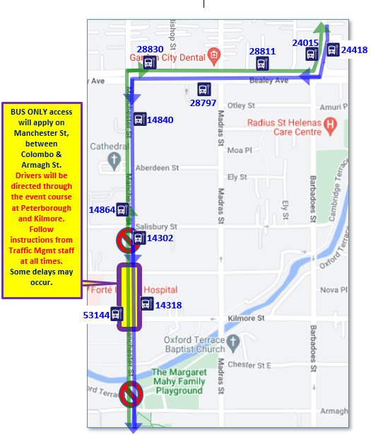 From 10:30am till 3:00pm – Buses travelling outbound towards the Airport will follow the normal route to Manchester St, continue on Manchester St, follow traffic management instructions on Manchester St, turn left on Bealey Ave, and continue on Harper Ave to resume the normal route.