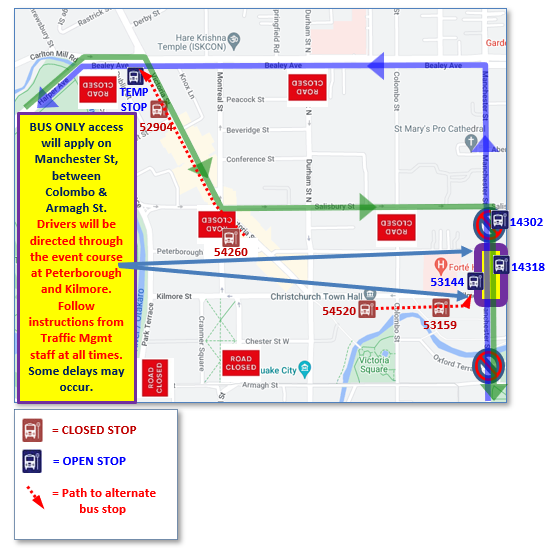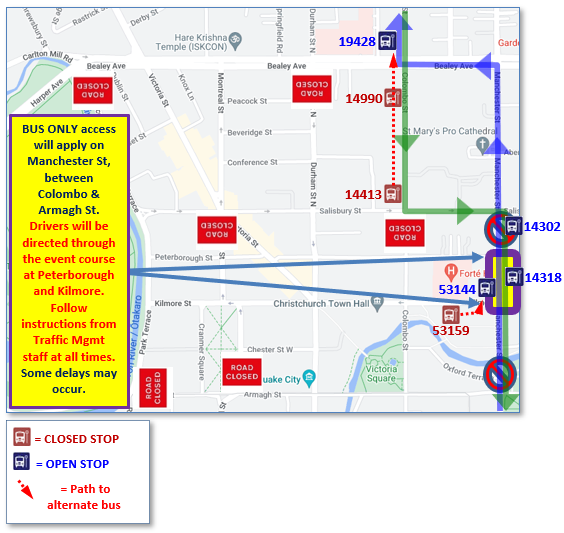 Buses travelling southbound towards Huntsbury will have no detour required, but will need to follow traffic management instructions on Manchester St.