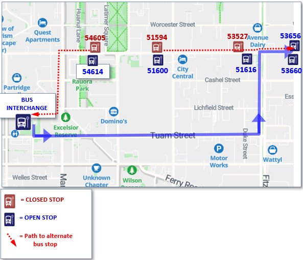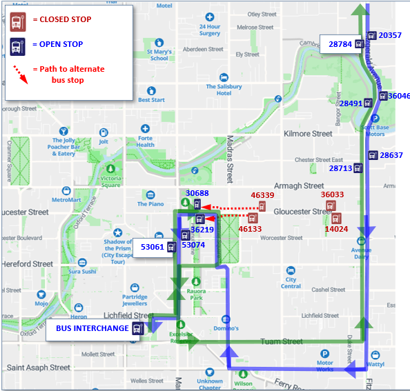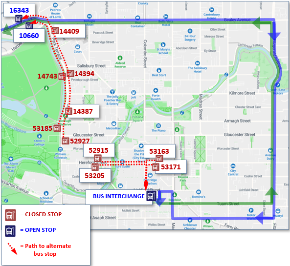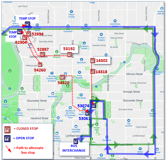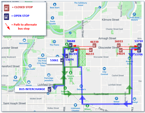 From first bus till 3:00pm - Buses travelling eastbound towards Southshore will follow the normal route to the Bus Interchange, exit the Bus Interchange via Tuam St, continue on Tuam St, turn left on Fitzgerald Ave, and turn right on Hereford St to resume the normal route.
