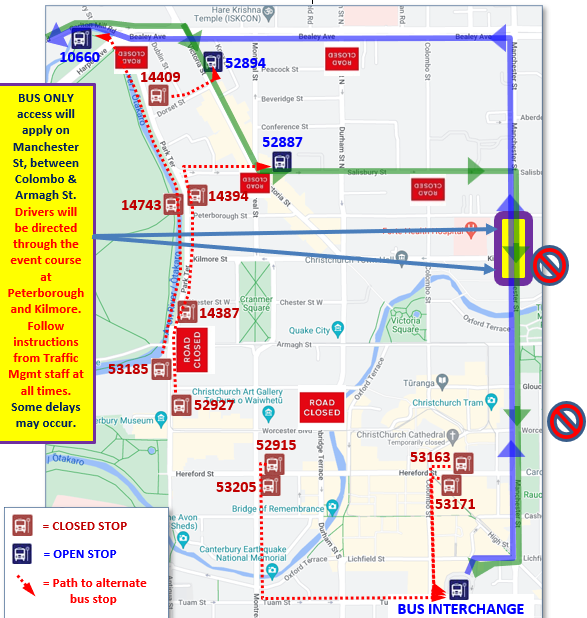 Buses travelling inbound towards the Bus Interchange will have no detour required, but will need to follow traffic management instructions on Manchester St.