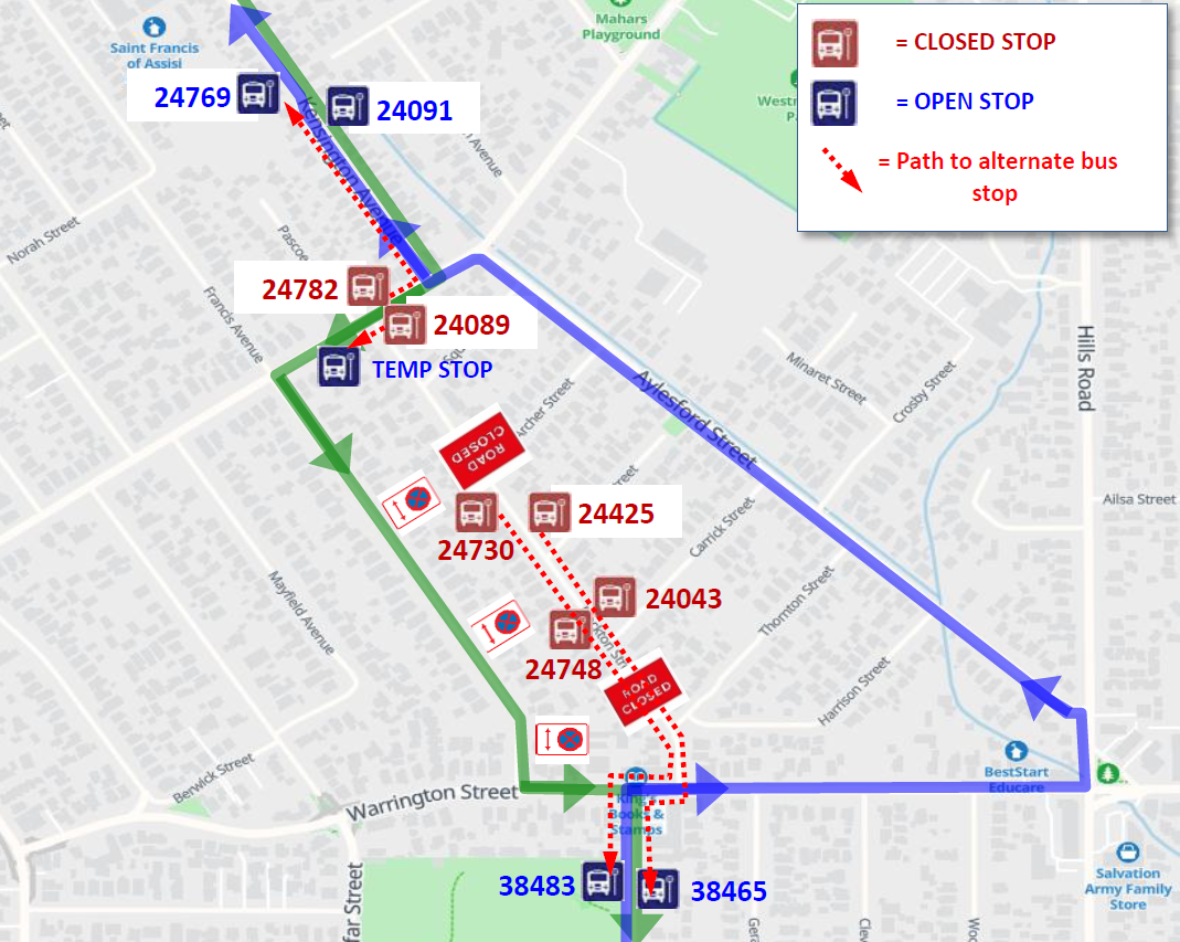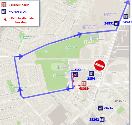 Buses travelling southbound towards Westlake will continue the normal route to Carmen Rd, turn right on Waterloo Rd, left on Parker St, left on Main South Rd, left on Carmen Rd, and left on Chalmers Street (Hornby Mall) to resume the normal route.