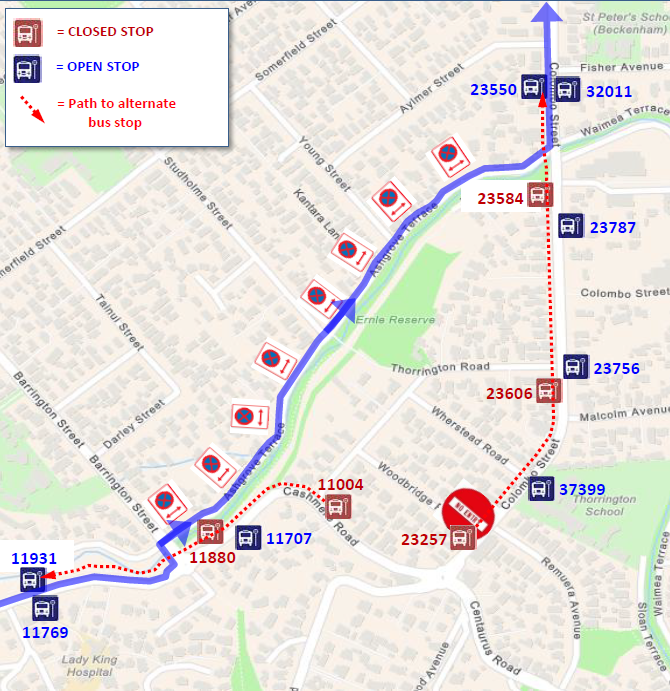 Buses travelling northbound towards Rangiora will follow the normal route along Cashmere Rd, take the first exit at the roundabout on to Barrington St, turn right on to Ashgrove Tce and turn left on to Colombo St to resume the normal route.