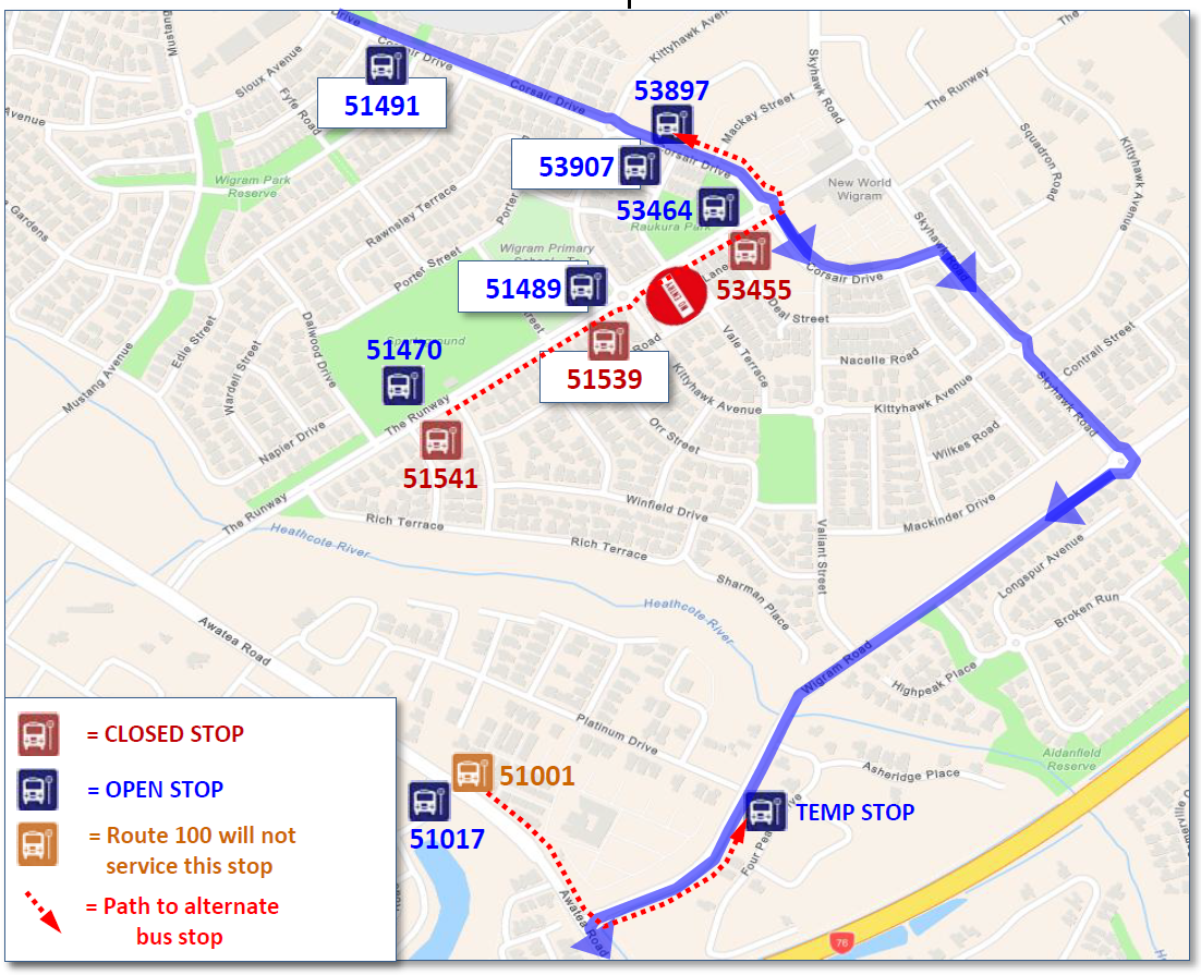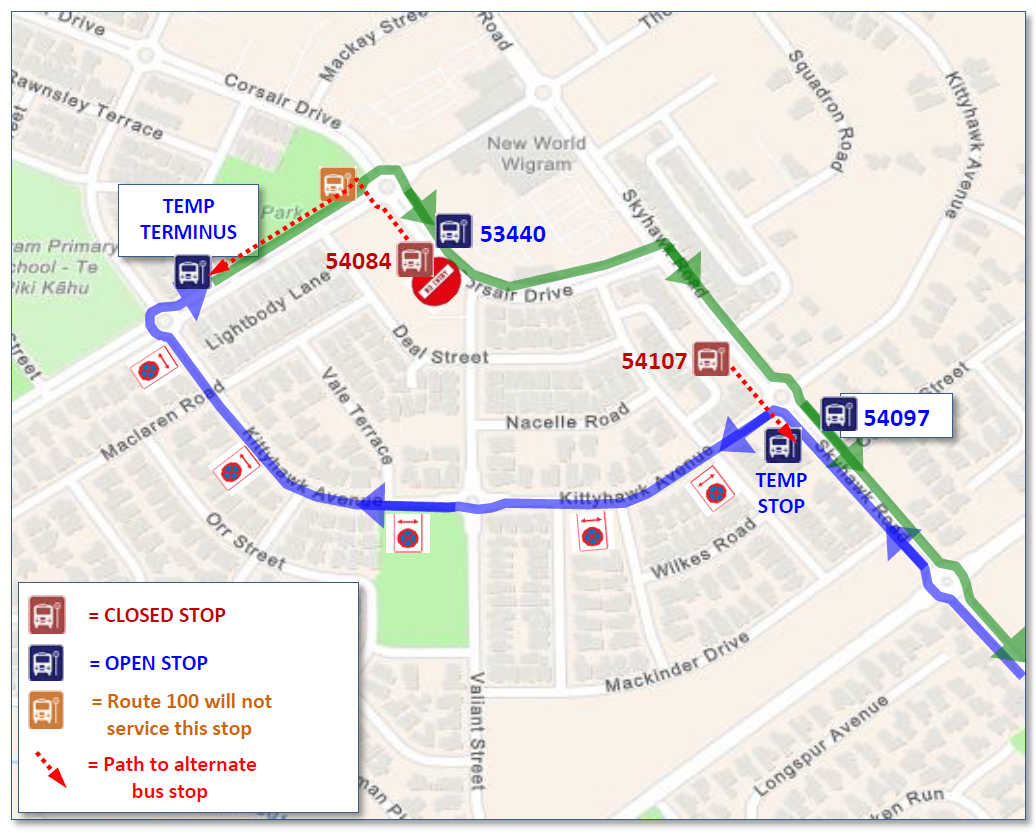 Buses travelling westbound towards Hillmorton and Wigram will follow the normal route to Skyhawk Rd, take the 1st exit at the Kittyhawk Ave roundabout, take the 2nd exit at the Valiant St roundabout, and take the 3rd exit at The Runway roundabout to finish trip at the temporary terminus on The Runway.