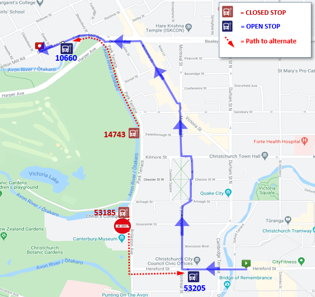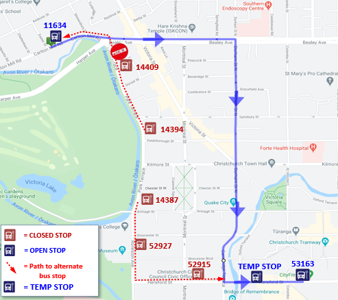 Buses travelling northbound towards Shirley/Dallington will follow the normal route to Bealey Ave, turn left on Madras St, turn right on Edgeware Rd and turn left on Barbadoes St to resume the normal route.