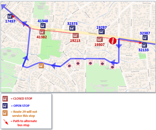 Buses travelling southbound towards Halswell will follow the normal route to Idris Rd, turn left on Fendalton Rd, turn right on Deans Ave, turn right on Kilmarnock St, and turn left on Straven Rd to resume the normal route.