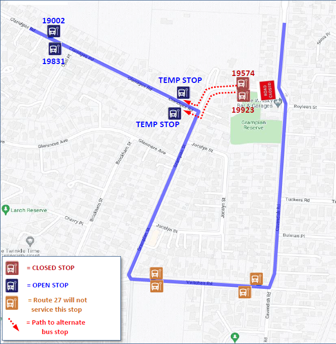 From Monday 13th October for 17 days there will be road works on Grampian St that will require the Route 27 service to detour from its usual route.