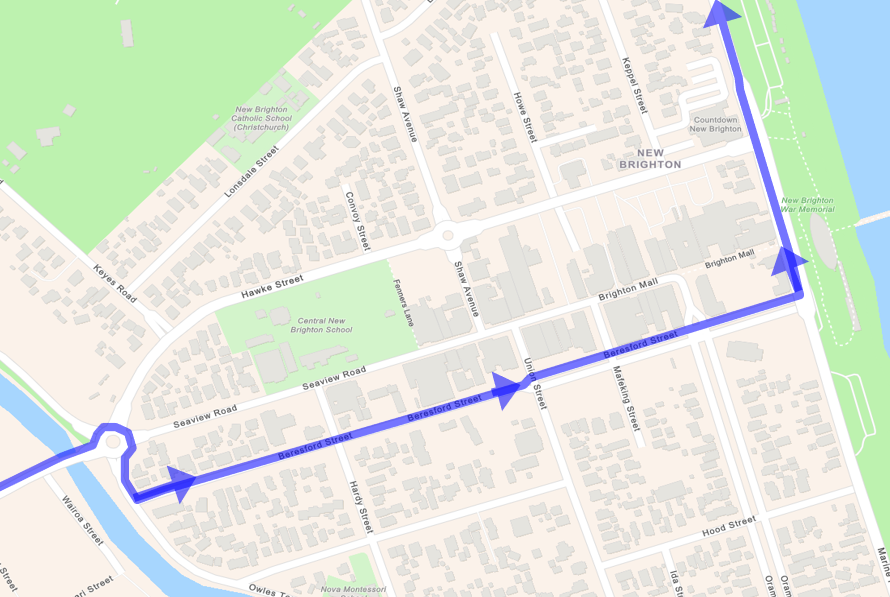 Northbound buses travelling towards Burnside will take the normal route to Coronation St before turning onto Selwyn St, Bletsoe Ave, Strickland St, Antigua St and resume the normal route on Antigua St.