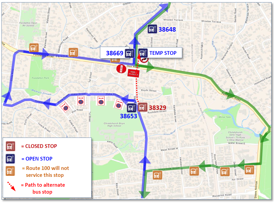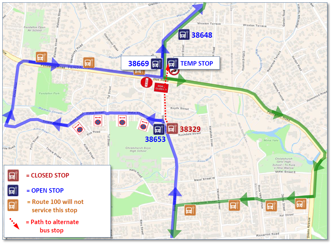 On Tuesday 7th April for 3 nights there will be road works on Fendalton Rd that will require the Route 100 service to detour from its usual route from 7pm till last bus.