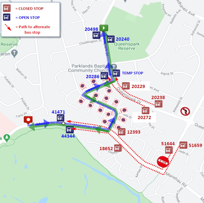 Buses travelling northbound towards Queenspark will continue the normal route to Mairehau Rd, turn left on Royal Park Dr, right on Brentwood St, and left on Queenspark Dr to resume the normal route.