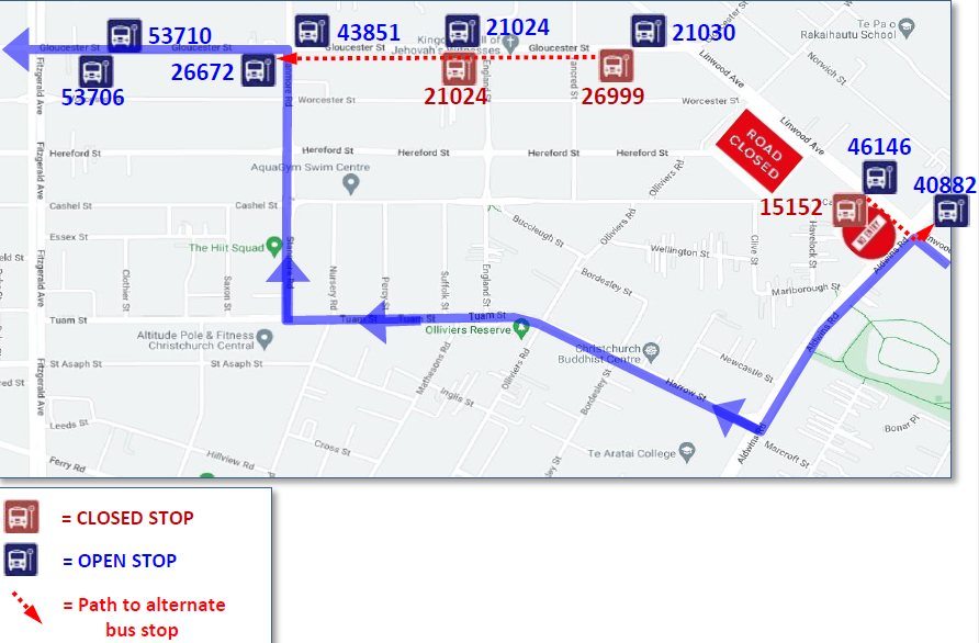 Buses travelling westbound towards Rolleston will follow the normal route along Buckleys Rd, continue on Aldwins Rd, turn right on to Harrow St, continue on Tuam St, turn right on to Stanmore Rd, take the second exit at the Hereford St roundabout and turn left on to Gloucester St to resume the normal route.