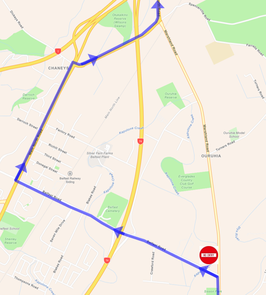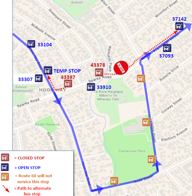 Buses travelling westbound towards Hei Hei will continue the normal route to Racecourse Rd, continue along Racecourse Rd, turn right on to Waterloo Rd, turn right on to SH1 Carmen Rd and turn left on to Buchanans Rd to resume the normal route.