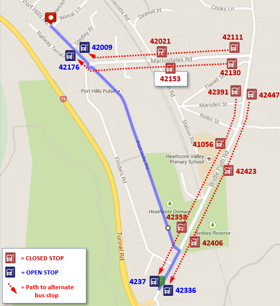 Buses travelling toward the city will detour from Adderley Tce to Sneyd St, Audley St, Island Rd, then to Silverstream Blvd to resume normal route. Passengers should use stops 53331 on Silverstream Blvd and 53401 on Island Rd. View detour map