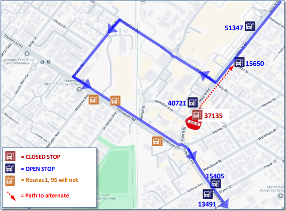 Buses travelling anticlockwise will continue the normal route to Waimairi Road, turn right on Wentworth St, left on Hounslow St, left on Maidstone Rd, and right onto Waimairi Rd to resume the normal route