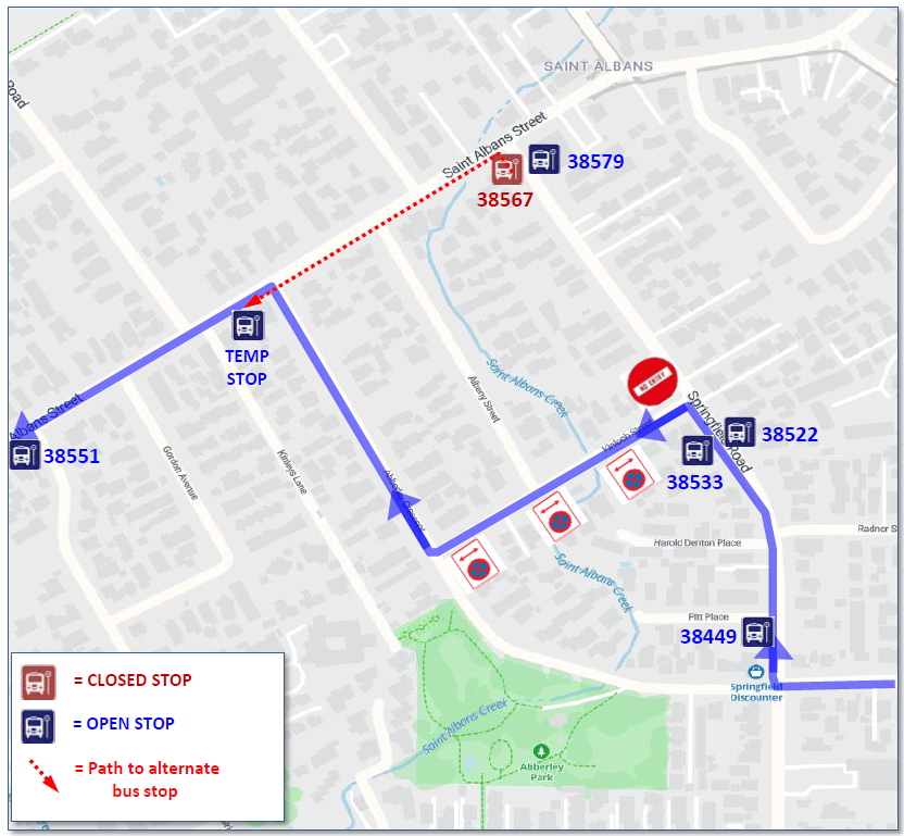 Buses travelling westbound towards Wigram will follow the normal route to Springfield Rd, turn left on Kinloch St, turn right on Abberley Cres, and turn left on Saint Albans St to resume the normal route.