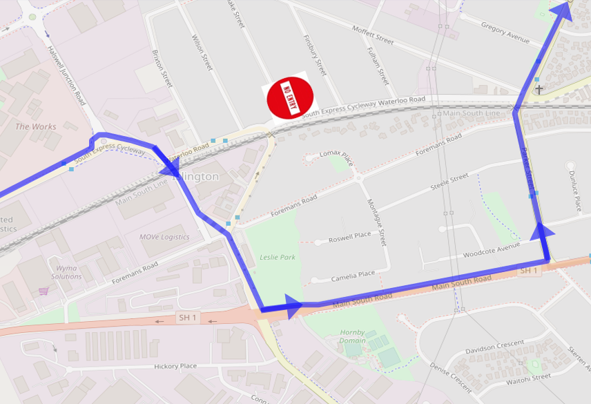 Buses travelling southbound towards Lyttelton will continue the normal route to Harewood Rd, take the 3rd exit at the Russley Road roundabout, continue on Russley Rd, take the 1st exit from SH1 Russley Rd. turn left onto Wairakei Rd, and continue on Wairakei Rd to resume the normal route.